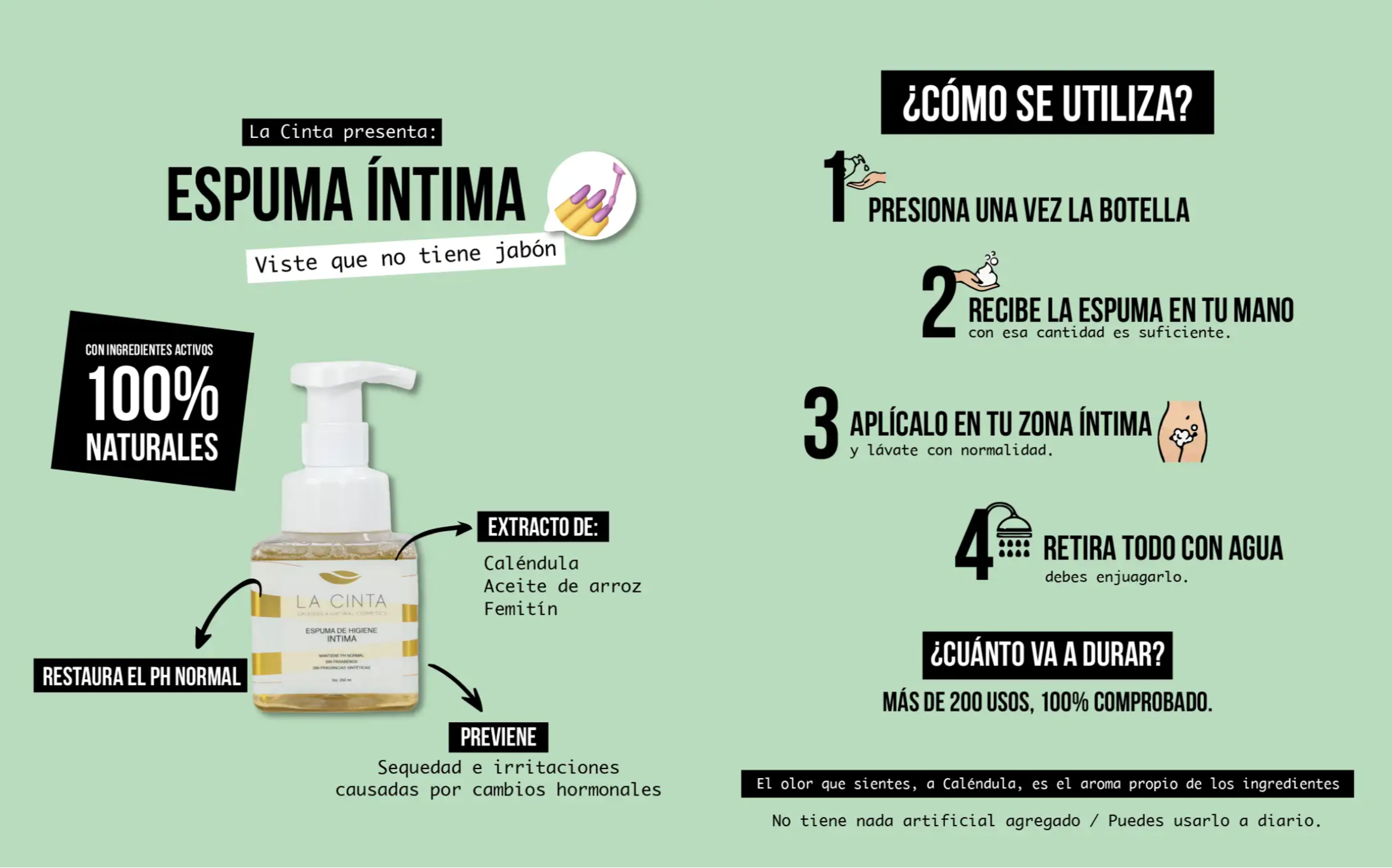 Me encanta , de verdad es muy rica yy lo mejor de todo es que de see que uso la espuma, no he tenido más infecciones urinarias!